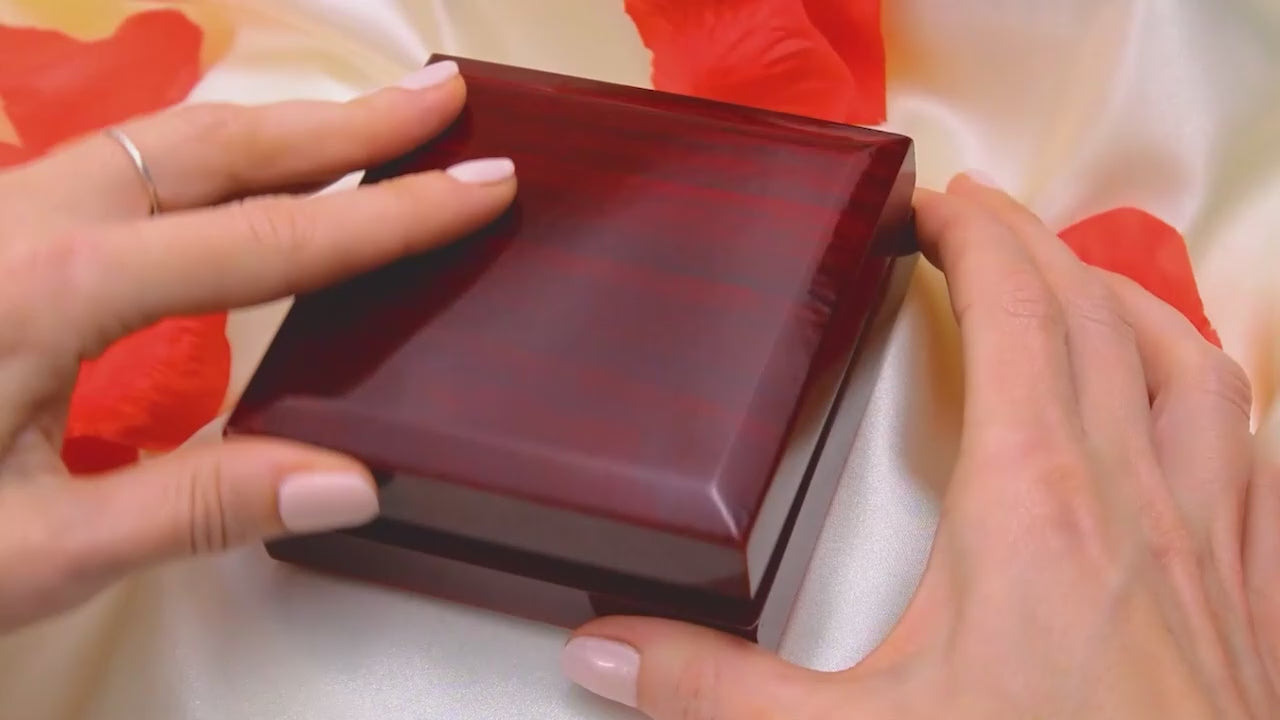 Your piece is lovingly packaged in a complimentary soft touch box for easy gifting. Elevate your presentation by upgrading to the mahogany style luxury box, which features a brilliant LED spotlight.